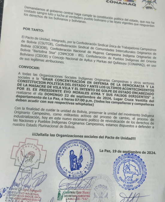 “Convocan: a todas las organizaciones sociales indígenas originarias campesinas y otros sectores a la “gran concentración en defensa de la democracia y la Constitución y ante los últimos acontecimientos del expresidente Evo Morales y sus falsos dirigentes” a realizarse el domingo 22 de septiembre, lugar Cruce Ventilla del departamento de La Paz, a horas 07.00 P.M” (sic) se lee en el comunicado.