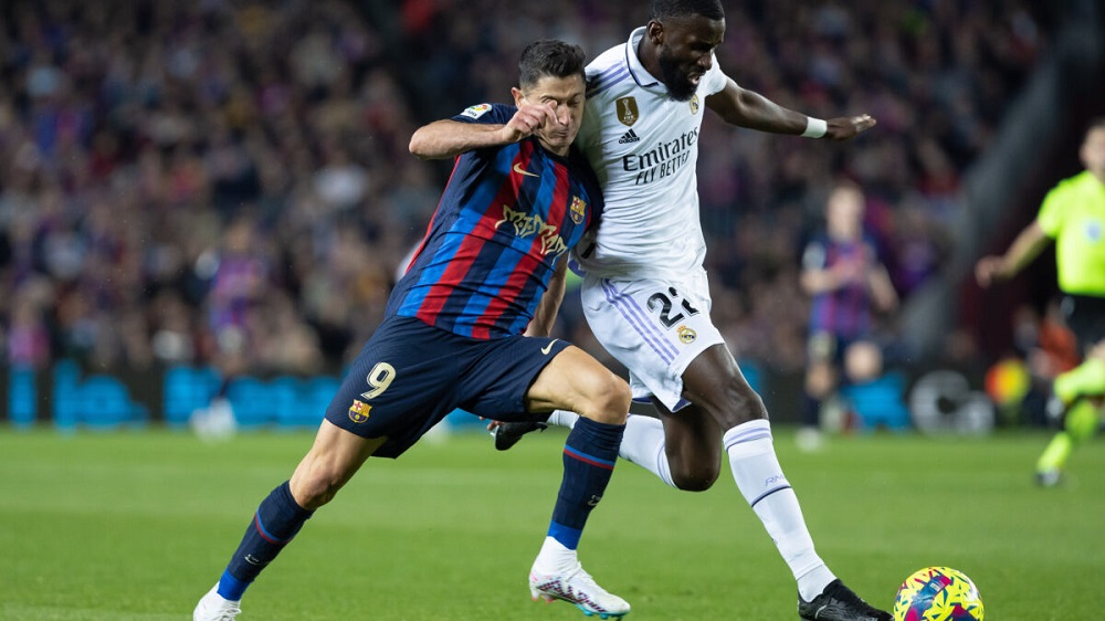 Solo un cabezazo de Tchouaméni preocupó a Barcelona, que siguió con su dominio de posesión y posición y lo dio vuelta con un penal de Robert Lewandowski, luego de una imprudente falta de Eduardo Camavinga a Gabi, revisión en el VAR mediante (36′). Tres minutos después, Raphinha aprovechó un fantástico centro de Jules Koundé y estampó el 3 a 1.