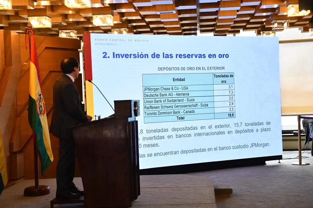 Espinoza dijo que el 85% de las RIN de Bolivia están concentradas en oro, el porcentaje más alto de la región, frente a Colombia (1%), Perú (5,4%), Brasil (6,7%) y Ecuador (36%).
