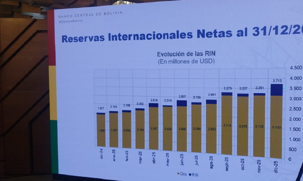 La Paz, Innovapress, 20 ene 2026.- Las Reservas Internacionales Netas (RIN) de Bolivia alcanzaron a diciembre de 2025 a $us 3,713 millones, de ellas, la mayor parte se encuentran en oro, lo que implica cierto riesgo, reportó este martes el presidente del Banco Central de Bolivia (BCB), David Espinoza.