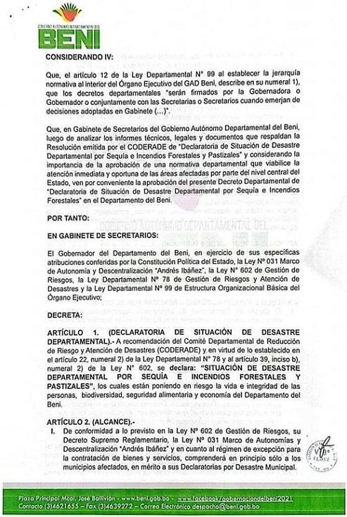 El decreto indica que se gestionará los requerimientos ante el Gobierno nacional, las Entidades Territoriales Autónomas del departamento, las instituciones públicas y privadas, el apoyo con equipo logístico u otros para las tareas de prevención, mitigación, recuperación y control de los incendios forestales y pastizales, entre otras disposiciones.