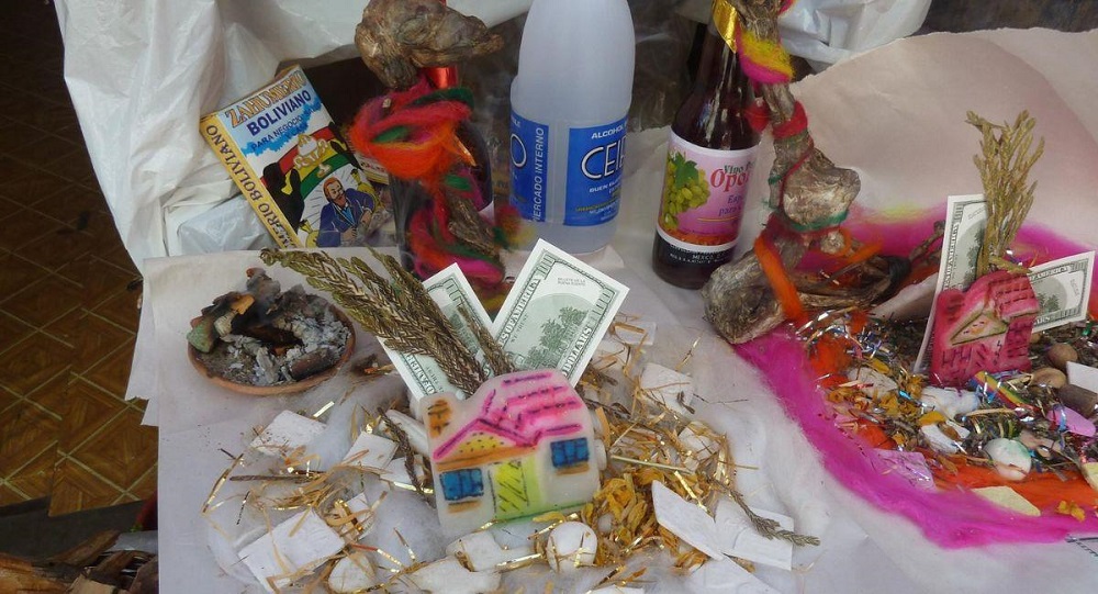 Una mesa que se ofrenda para agradecer a la Madre Tierra o Pachamama en un martes de Ch’alla/ arch referencial