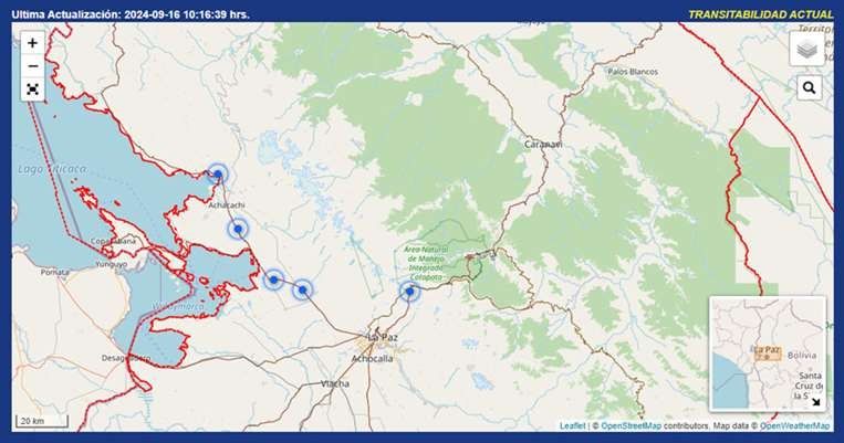 - Los sitios están en: La Cumbre – Alto Lima, la ruta Desaguadero-Patamanta, Patamanta-Huarina, Huarina-Achacachi y Achacachi-Ancoraimes. No obstante, las salidas al interior desde La Paz, son normales.