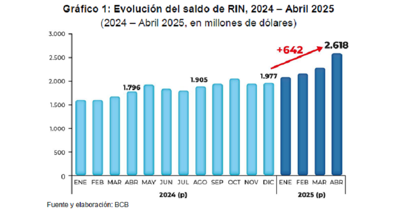 El comportamiento de las RIN evidencia una tendencia al alza desde diciembre de 2024, cuando cerraron en $us 1.977 millones. En los cuatro primeros meses de 2025 se registró un incremento sostenido hasta alcanzar el nivel actual.