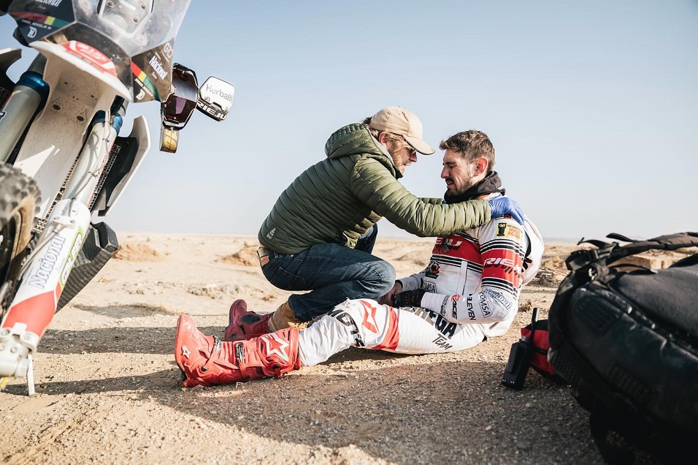 - ‘Aquí estamos en la etapa ocho fue una dura caída quedé fuera de la competencia, pero vamos a volver más fuertes’, manifestó. Fue auxiliado en un helicóptero. Su equipo, Rieju Pedrega, lamentó que no pueda seguir.