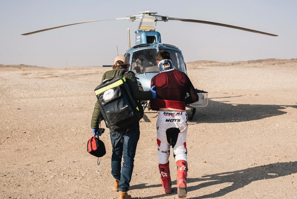 Fue rescatado en helicóptero de la organización y trasladado hasta Al Duwadimi, donde se dio inicio la etapa para la revisión médica.
