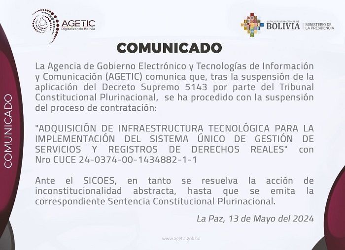 La Paz, Innovapress, 14 may 2024.- La Agencia de Gobierno Electrónico y Tecnologías de Información y Comunicación (Agetic) suspendió la adquisición de infraestructura tecnológica de implementación del Sistema Único de Gestión de Servicios y Registros para Derechos Reales en el marco de lo dispuesto por el DS 5143 que ha quedado en suspenso por un control de constitucionalidad en Sucre.