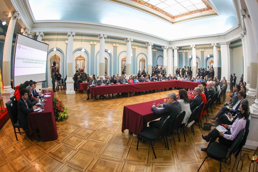 La Paz, Innovapress, 30 sep 2024.- Luego de firmar el decreto 5235 en Santa Cruz que declara “desastre nacional” al país por los incendios forestales, el presidente Luis Arce se reunió por la tarde en La Paz, con el cuerpo diplomático acreditado en Bolivia en Cancillería para solicitar ampliar la cooperación internacional y reportar que son 6,9 millones de hectáreas las afectadas por las quemas en territorio nacional.