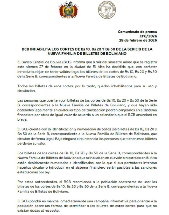 La Paz, Innovapress, 28 feb 2026.- El Banco Central de Bolivia (BCB) informó este sábado que, tras el siniestro aéreo la tarde noche en El Alto, quedan sin validez legal los billetes de Bs10, Bs20 y Bs50 de la Serie B de la Nueva Familia de Billetes de Boliviano.