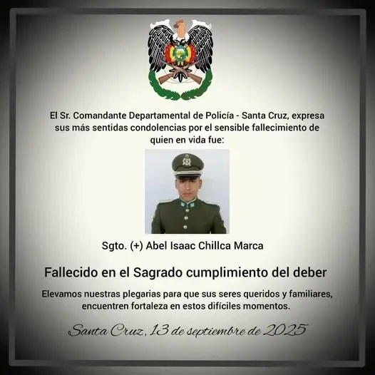Santa Cruz, Innovapress, 13 sep 2025.- El sargento de la Policía, Abel Chillca Marca, falleció pasadas las 13.00 de este sábado luego de luchar durante varias semanas contra las heridas causadas por las quemaduras que sufrió en la explosión del 19 de agosto en una fábrica de colchones en el sexto anillo del Parque Industrial de Santa Cruz.