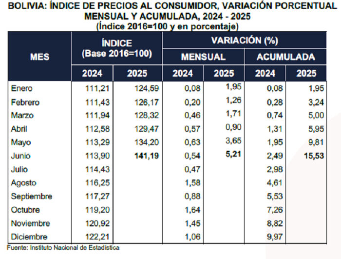 La Paz, Innovapress, 2 jul 2025.- El Instituto Nacional de Estadística (INE) reportó este miércoles que la inflación en Bolivia alcanzó el 5,21% en junio, alta para un solo mes y la acumulada de 15,53%.