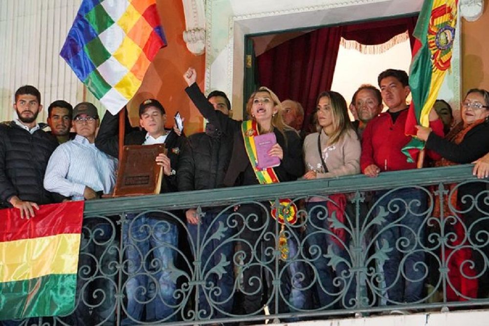 La noche cuando Áñez en el balcón de Palacio Quemado proclamó su mandato, a su lado, Camacho y Pumari/ arch-APG