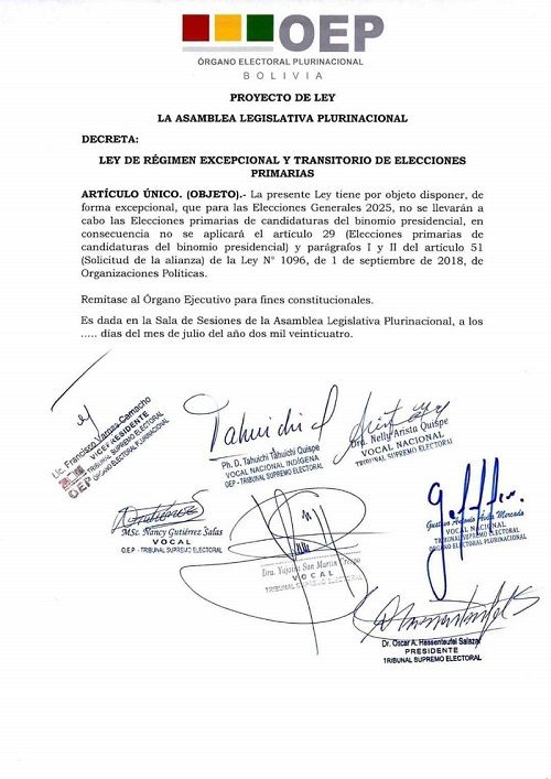 “La presente ley tiene por objeto disponer de forma excepcional que para las elecciones generales 2025, no se llevaran a cabo las elecciones primarias de candidaturas del binomio presidencial, en consecuencia, no se aplicará el articulo 29 (elecciones primarias de candidaturas del binomio presidencial), y parágrafos I y II del articulo 51 (Solicitud de alianza) de la ley 1096, de 1 de septiembre de 2018, de organizaciones políticas”, señala el proyecto de ley.