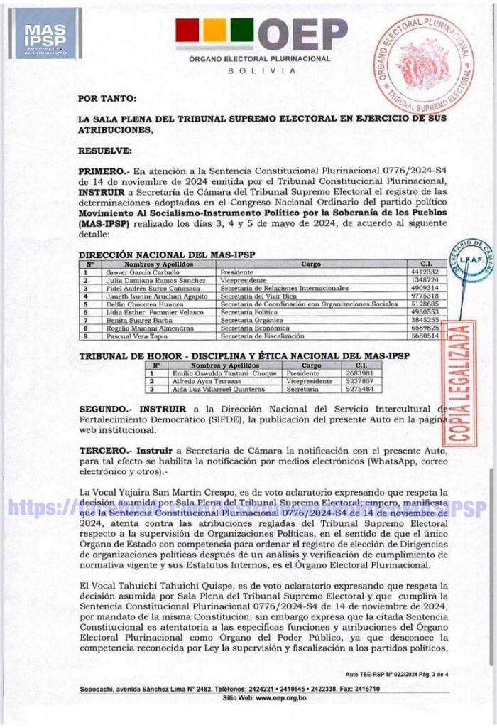 La Paz, Innovapress, 27 nov 2024.- El Tribunal Supremo Electoral (TSE) notificó este miércoles con el Auto 022/2024 a Grover García como presidente del Movimiento Al Socialismo Instrumento Por la Soberanía de los Pueblos (MAS-IPSP), desplazando de esa forma a Evo Morales, quien controló el partido por un cuarto de siglo sin dar lugar a nuevas generaciones.