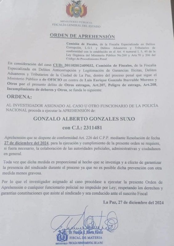 De acuerdo con el tenor de la orden de aprehensión, el Ministerio Público sigue un proceso penal en contra del subalcalde por la presunta comisión de los delitos de incumplimiento de deberes, estragos y otros.