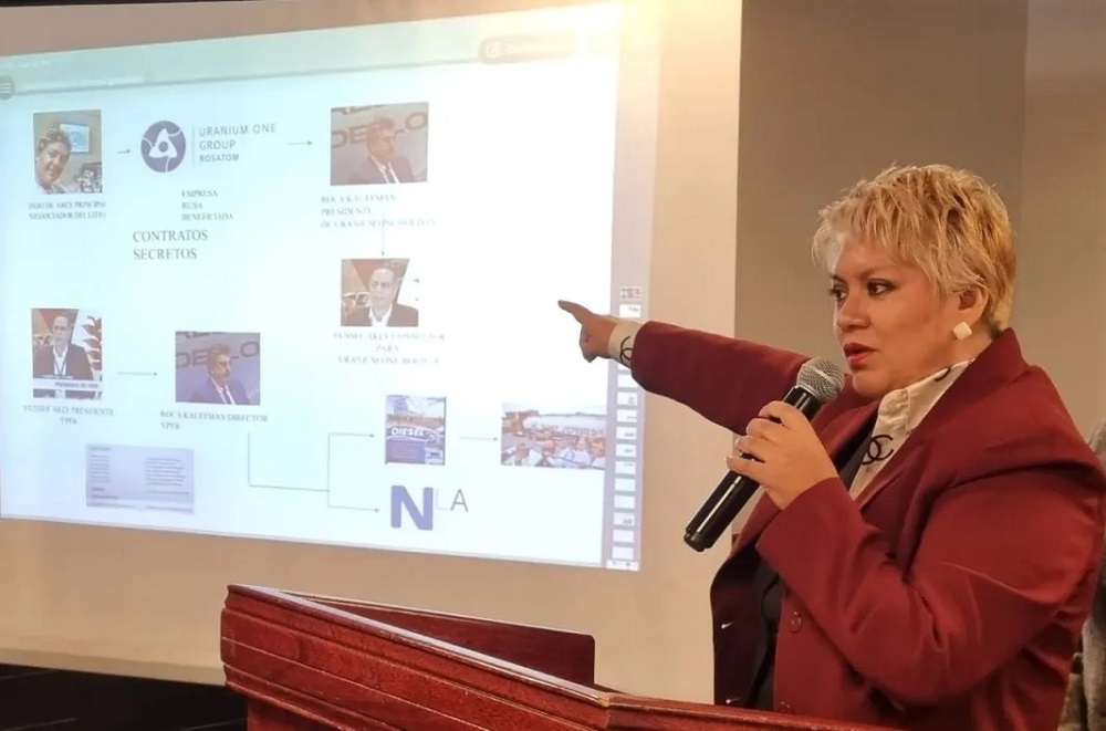 Mostró un organigrama de lo que denominó el “cártel de la gasolina basura”. Entre los señalados figura Marcelo Arce Mosqueira, hijo de Arce, descrito como el “gran negociador del litio”, y Jorge Alberto Roca Kauffman, expresidente de Lithium One Bolivia –filial de Uranium One Rusia– y actual director de YPFB.