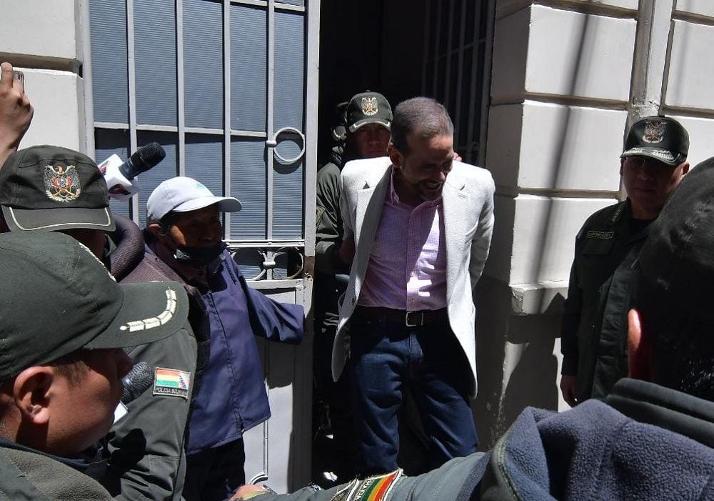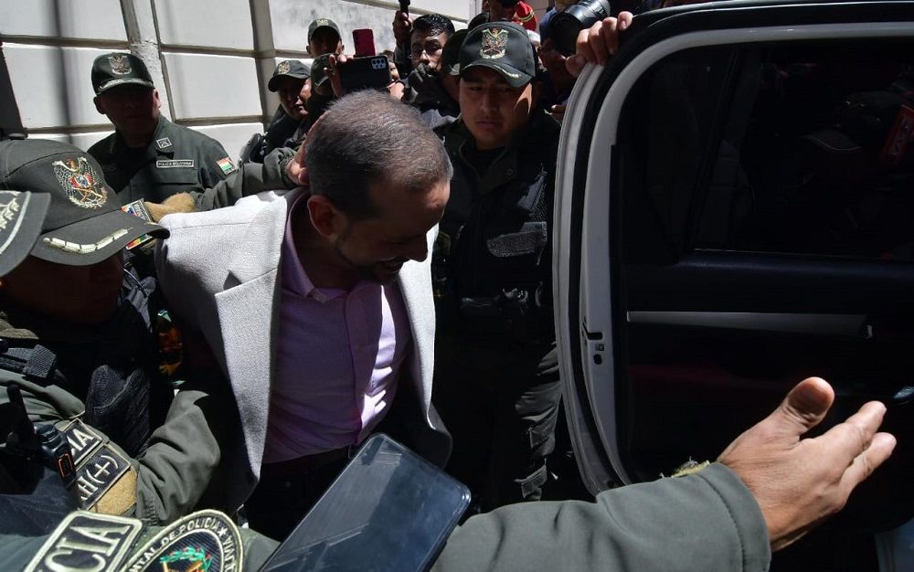 La Paz, Innovapress, 25 nov 2024.- Con manillas y las manos atrás, así llegó Luis Fernando Camacho, el gobernador suspendido de Santa Cruz a su audiencia oral la mañana de este lunes hasta el salón rojo del Tribunal Departamental de Justicia de La Paz, audiencia que fue postergada hasta el 6 de enero de 2025.
