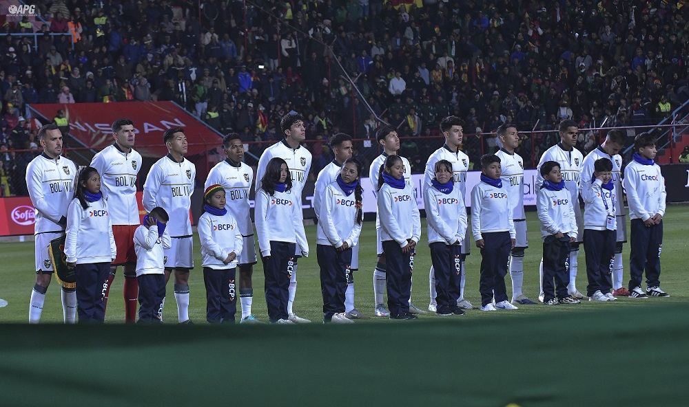 Enzo Monteiro, delantero de la Selección boliviana (21) conmovió cuando se entonaron las notas del Himno Nacional.