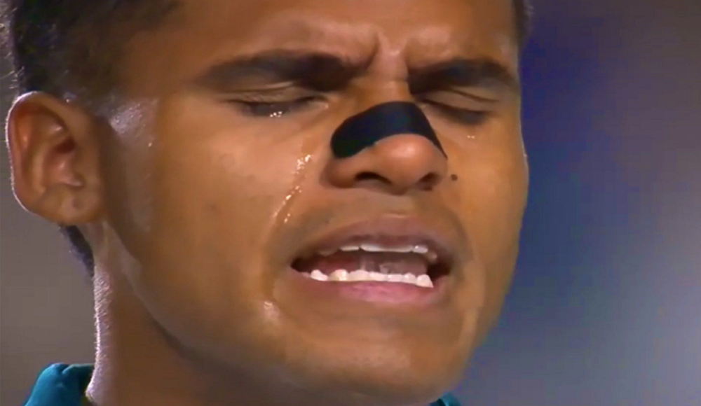 La transmisión oficial captó justo el momento en el que el jugador de FK Auda, de Letonia entonaba con mucho fervor derramando lágrimas al mismo tiempo. Es hijo del brasileño Edu Monteiro.