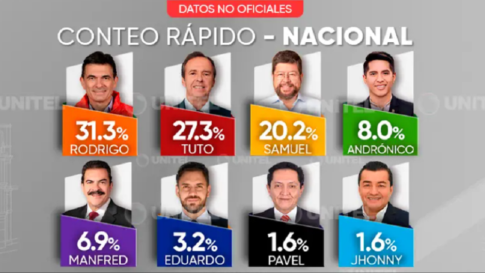 Según los datos de Captura, Paz Pereira llega al 31,6% de los votos, mientras que Tuto le sigue con 27,1%. En tercer lugar, queda Samuel Doria Medina, con el 19,5%.