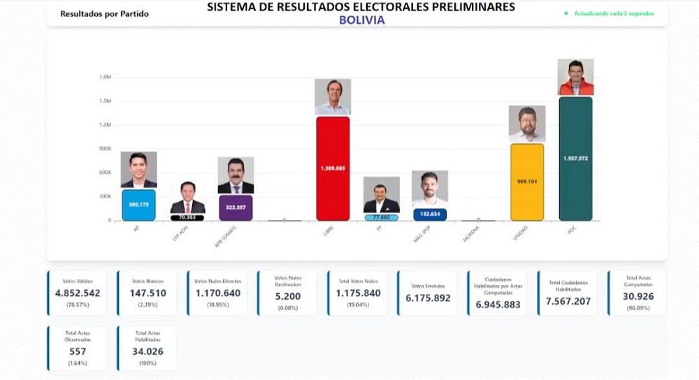 El Sistema de Transmisión de Resultados Preliminares (Sirepre) del Tribunal Supremo Electoral (TSE), sobre la base de más del 90% de actas escrutadas ratifica la tendencia: Rodrigo Paz Pereira preside la votación a nivel nacional mantiene el primer lugar en el escrutinio preliminar con una votación del cercana al 32%, seguido por Jorge Tuto Quiroga, con un el 27%.
