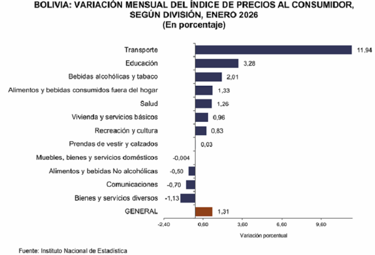 La Paz, Innovapress, 04 feb 2026.- La variación mensual del Índice de Precios al Consumidor (IPC) de enero fue de 1,31% respecto a diciembre de 2025 y la acumulada a 12 meses de 19,64%, reportó el miércoles el Instituto Nacional de Estadística (INE).