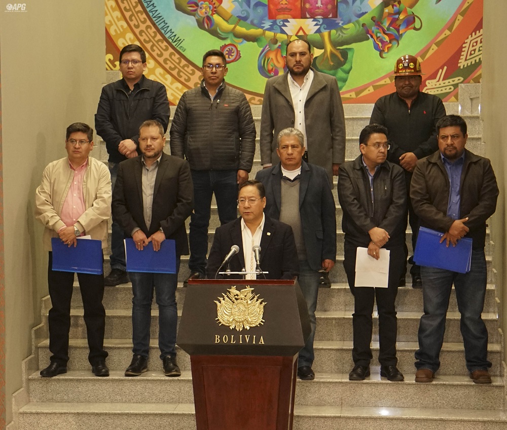 Arce flanqueado de sus ministros en Casa Grande del Pueblo/ Fotos: Francisco Riveros-APG