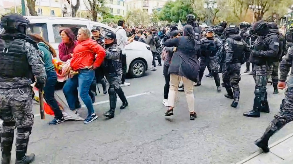 La Paz, Innovapress, 22 abr 2026.- La policía antimotines incursionó la mañana de este miércoles con gases lacrimógenos una movilización de maestros que ingresaron hasta plaza Murillo en procura de mayor presupuesto para educación e incremento salarial.