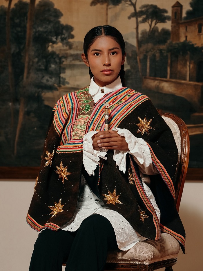 La producción fue realizada junto a la marca @juandelapazofficial, la fotógrafa @valentinaluizaga y el productor @hanielo_, como un homenaje a las manos tejedoras, las raíces culturales y el brillo de la mujer indígena contemporánea.