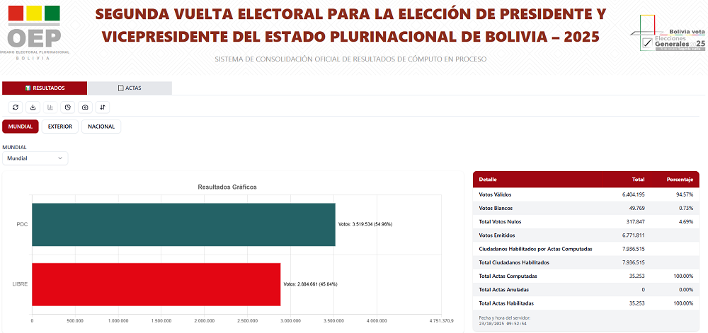 La Paz, Innovapress, 23 oct 2025.- La noche de este miércoles (22.10.2025) el Tribunal Supremo Electoral (TSE) terminó el cómputo oficial de las actas de escrutinio confirmando la victoria del Partido Demócrata Cristiano (PDC) y sus candidatos Rodrigo Paz y Edmand Lara, a la Presidencia y Vicepresidencia de Bolivia respectivamente.