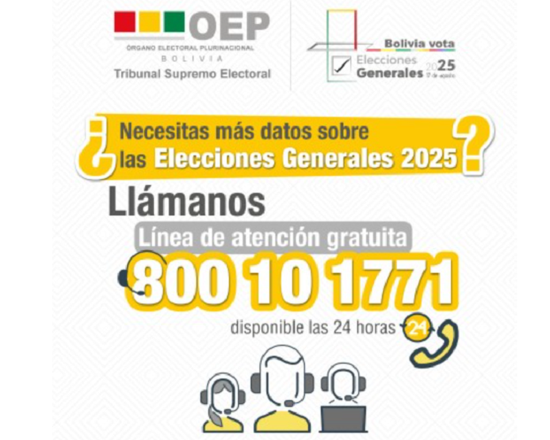 La Paz, Innovapress, 17 ago 2025.- El Órgano Electoral Plurinacional (OEP) habilitó la línea gratuita del 800 10 1771 para atender consultas y resolver dudas relacionadas con el proceso eleccionario cuando la población elegirá a un nuevo Gobierno.