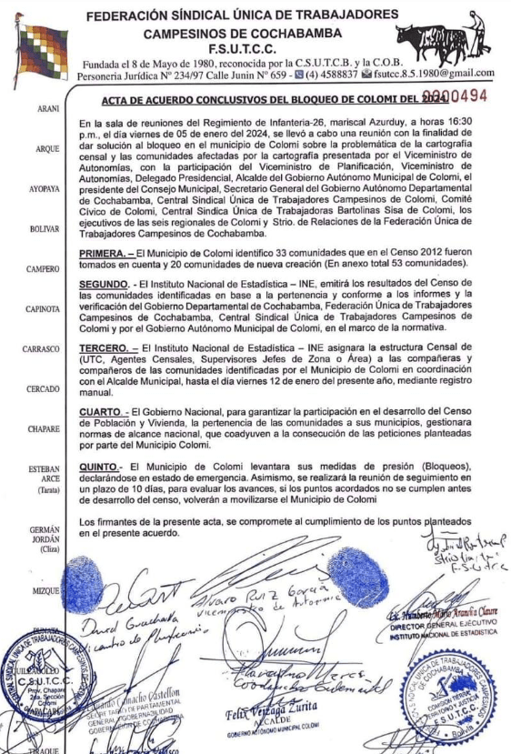 El segundo, señala que “el INE emitirá los resultados del censo de las comunidades identificadas en base a la pertenencia y conforme a los informes y la verificación del Gobierno Departamental de Cochabamba, la Federación Única de Trabajadores Campesinos de Cochabamba, Central Sindical Única de Trabajadores Campesinos de Colomi y el Gobierno Municipal de Colomi, en el marco de la normativa”.