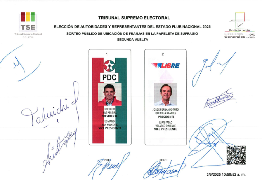 La Paz, Innovapress, 3 sep 2025.- Continuando con la actividad 15 del cronograma electoral rumbo a la segunda vuelta de las elecciones generales del próximo domingo 19 de octubre, el Órgano Electoral Plurinacional (OEP) procedió este miércoles al sorteo de la papeleta electoral que situó a Rodrigo Paz, a la izquierda y, Jorge Quiroga, a la derecha.