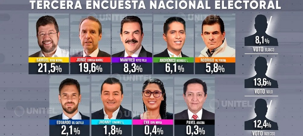 La Paz, Innovapress, 30 jul 2025.- La tercera encuesta de la encuestadora Ipsos-Ciesmori develó la noche del miércoles que el candidato Samuel Doria Medina de la alianza Unidad se distancia con el 21,5% respecto de Jorge Tuto Quiroga de la alianza Libre que tiene el 19,6%, es decir que los dos se perfilan para ir a la segunda vuelta del 20 de octubre al no alcanzar el 50% más uno de la preferencia electoral.