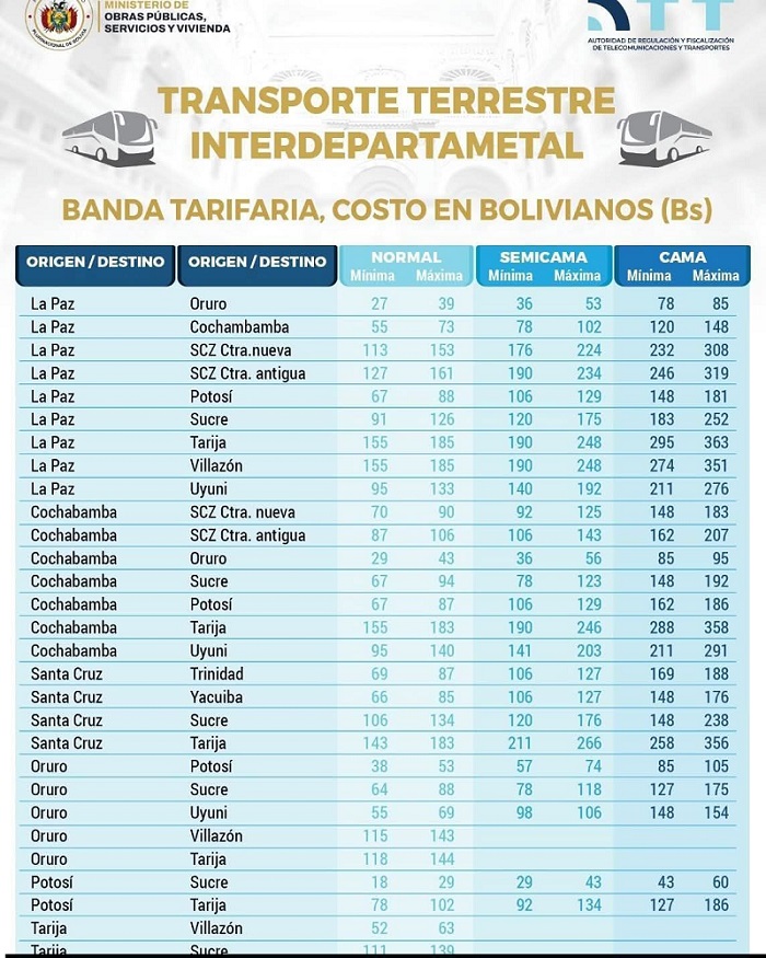 La Paz, Innovapress, 2 ene 2026.- Tras la vigencia del DS 5503 que levanta la subvención a los combustibles, las empresas de transporte interdepartamental de pasajeros abusaron con el cobro de las tarifas, es así, que inclusive un pasaje en la vía La Paz-Santa Cruz llegó a costar Bs 500. Desde este 2 de enero rige una nueva tabla, así fue aprobada entre la Autoridad de Regulación y Fiscalización de Telecomunicaciones y Transportes (ATT) y la dirigencia de los choferes.