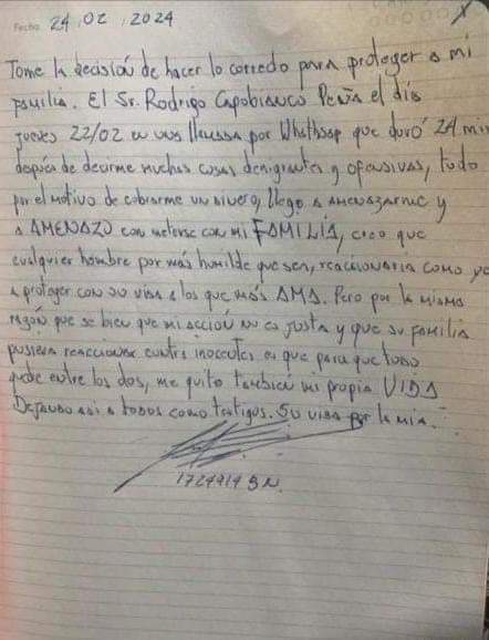 «El señor Rodrigo Capobianco Peña, el día jueves 22 febrero me llamó por WhatsApp que duró 24 minutos, después de decirme muchas cosas denigrantes y ofensivas. Todo por cobrarme un dinero, amenazó a mi familia».