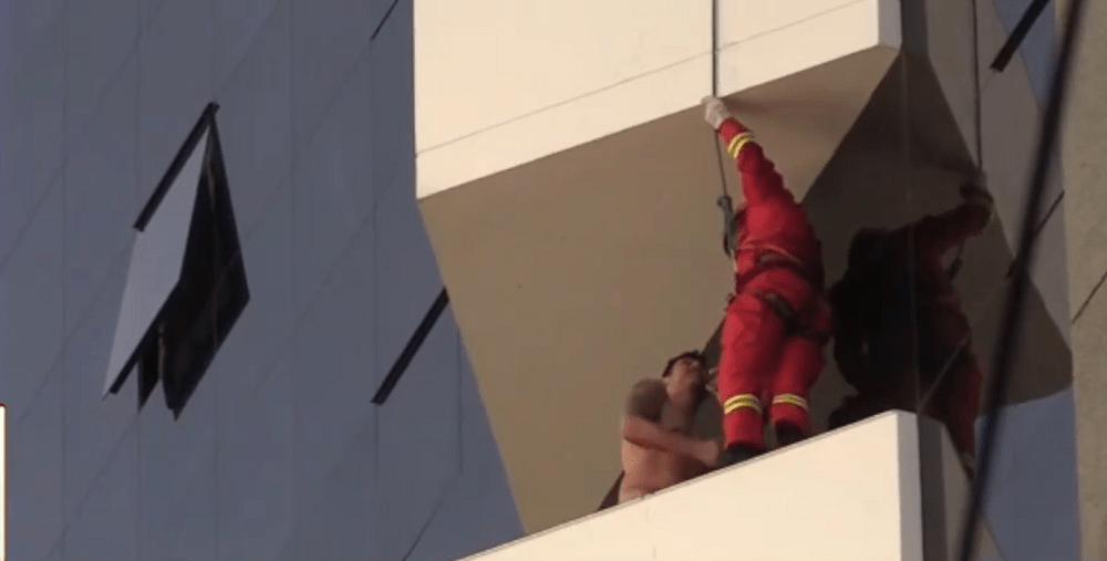 Bomberos realizó un descenso desde el piso 16 del edificio. Uno de los efectivos sujetó al hombre en el momento en que este intentaba saltar y luego logró introducirlo al interior de la habitación.