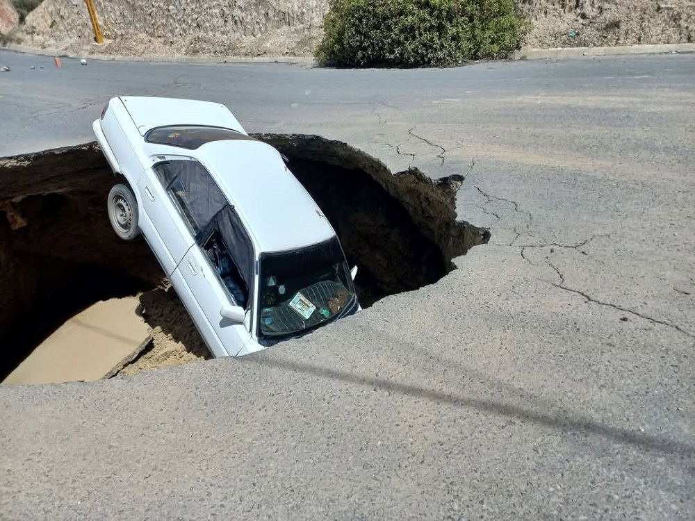 Un sifonamiento se traga un vehículo en plena vía entre Achocalla y Mallasilla, zona Sur de La Paz